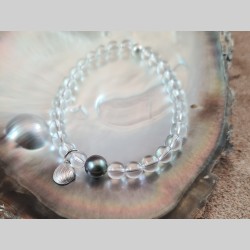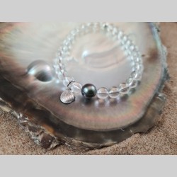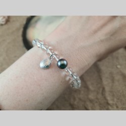 Bracelet en perles de cristal de roche, avec une véritable perle noire de Tahiti et un charm créé à partir d'un coquillage du lac Léman ramassé à Nyon