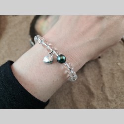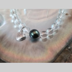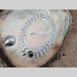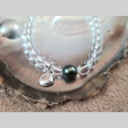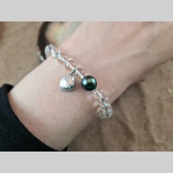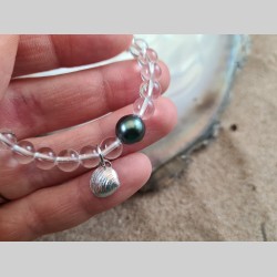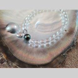 Bracelet en perles de cristal de roche, avec une véritable perle noire de Tahiti et un charm créé à partir d'un coquillage du lac Léman ramassé à Nyon