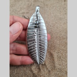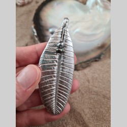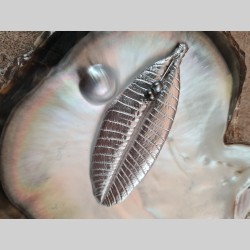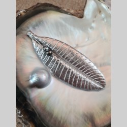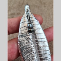 Pendentif créé à partir d'une véritable feuille de frangipanier en argent rhodié, avec deux jolies keshis de Tahiti.
