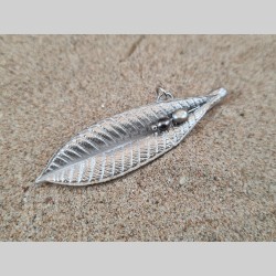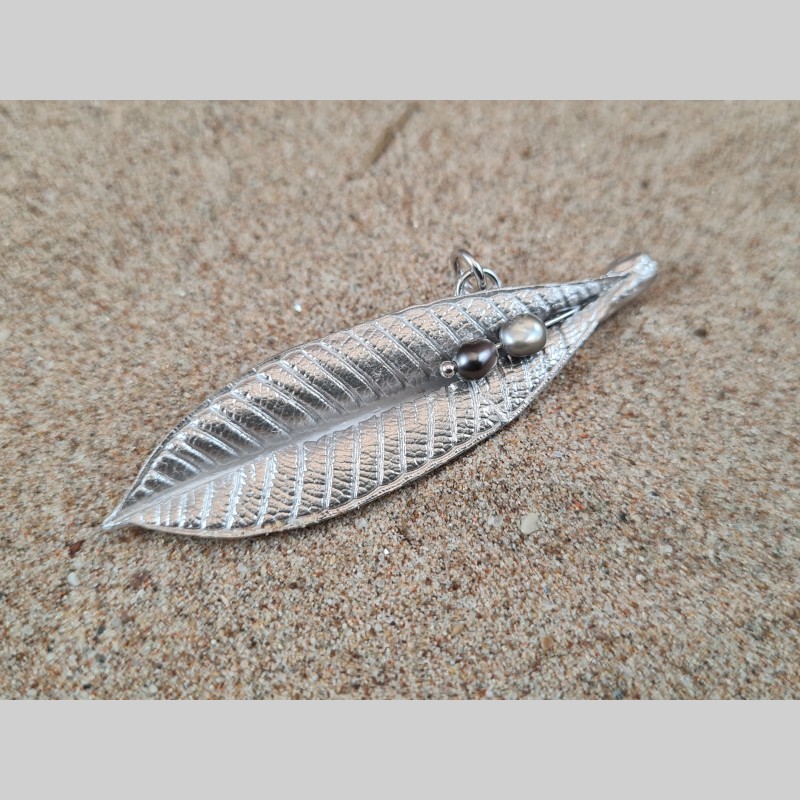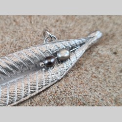 Pendentif créé à partir d'une véritable feuille de frangipanier en argent rhodié, avec deux jolies keshis de Tahiti.