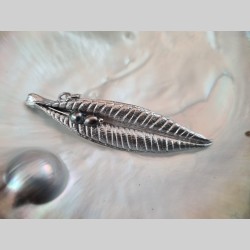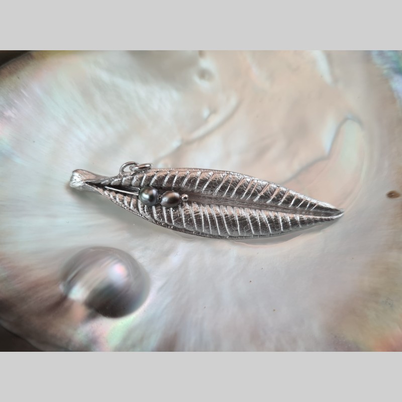 Pendentif créé à partir d'une véritable feuille de frangipanier en argent rhodié, avec deux jolies keshis de Tahiti.
