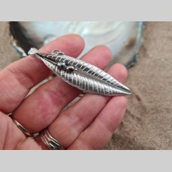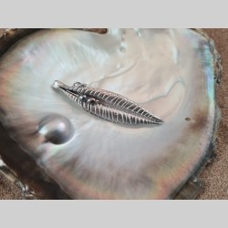 Ce pendentif fait partie de ma collection Tahiti-Nyon, inspirée par des perles noires de Tahiti et des feuilles de frangipanier rapportées par ma tante habitant Papeete depuis plus de 30 ans, ainsi que par des coquillages ramassés aux abords du lac Léman à Nyon, ma ville.