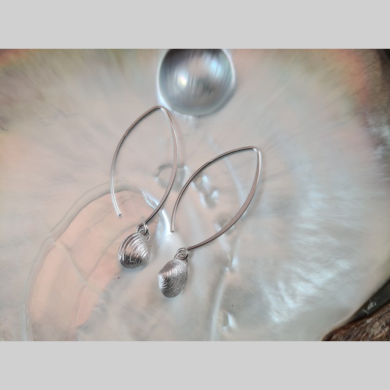 Boucles d’oreilles créées à partir de coquillages ramassés au bord du lac Léman, à Nyon en argent rhodié.